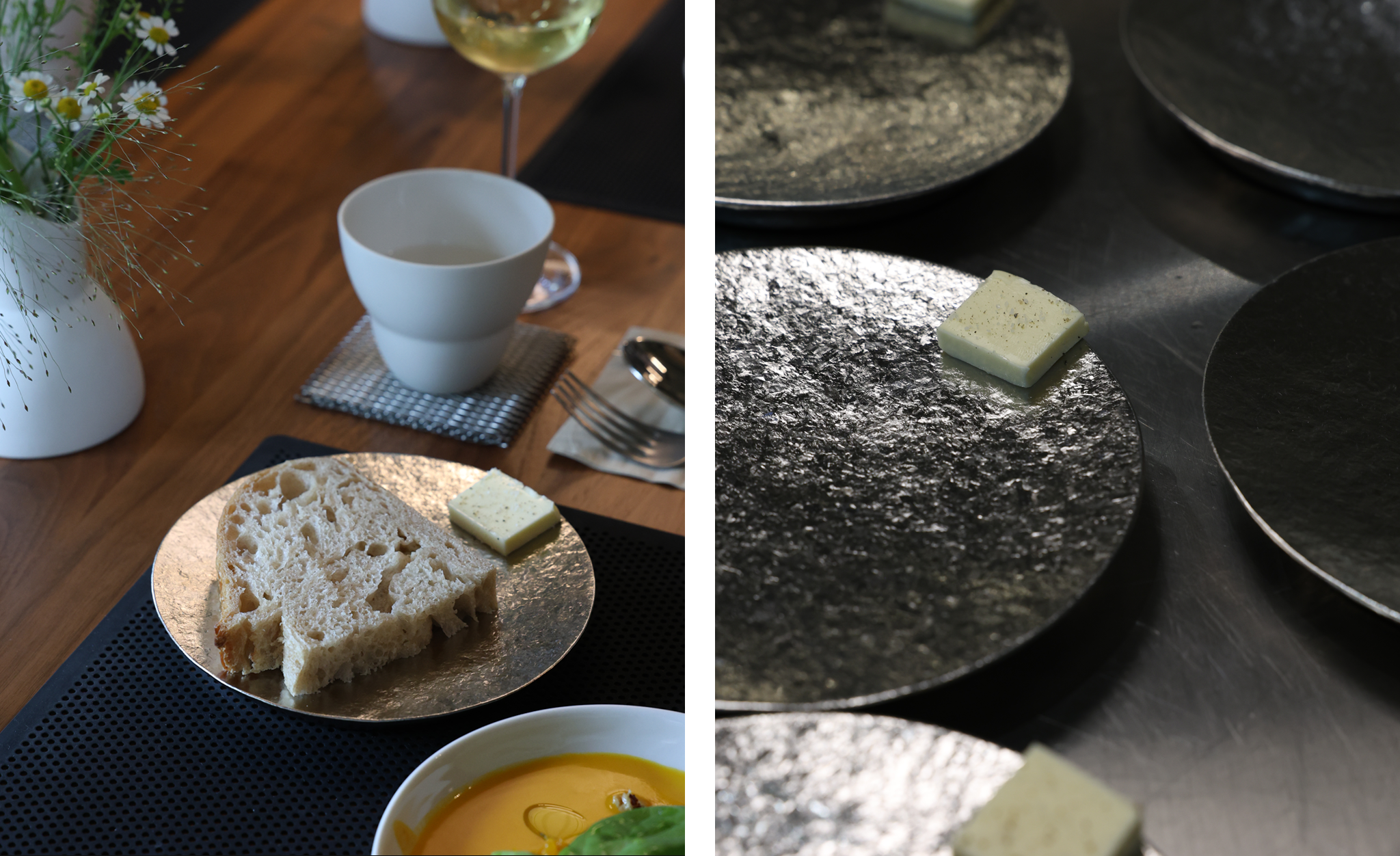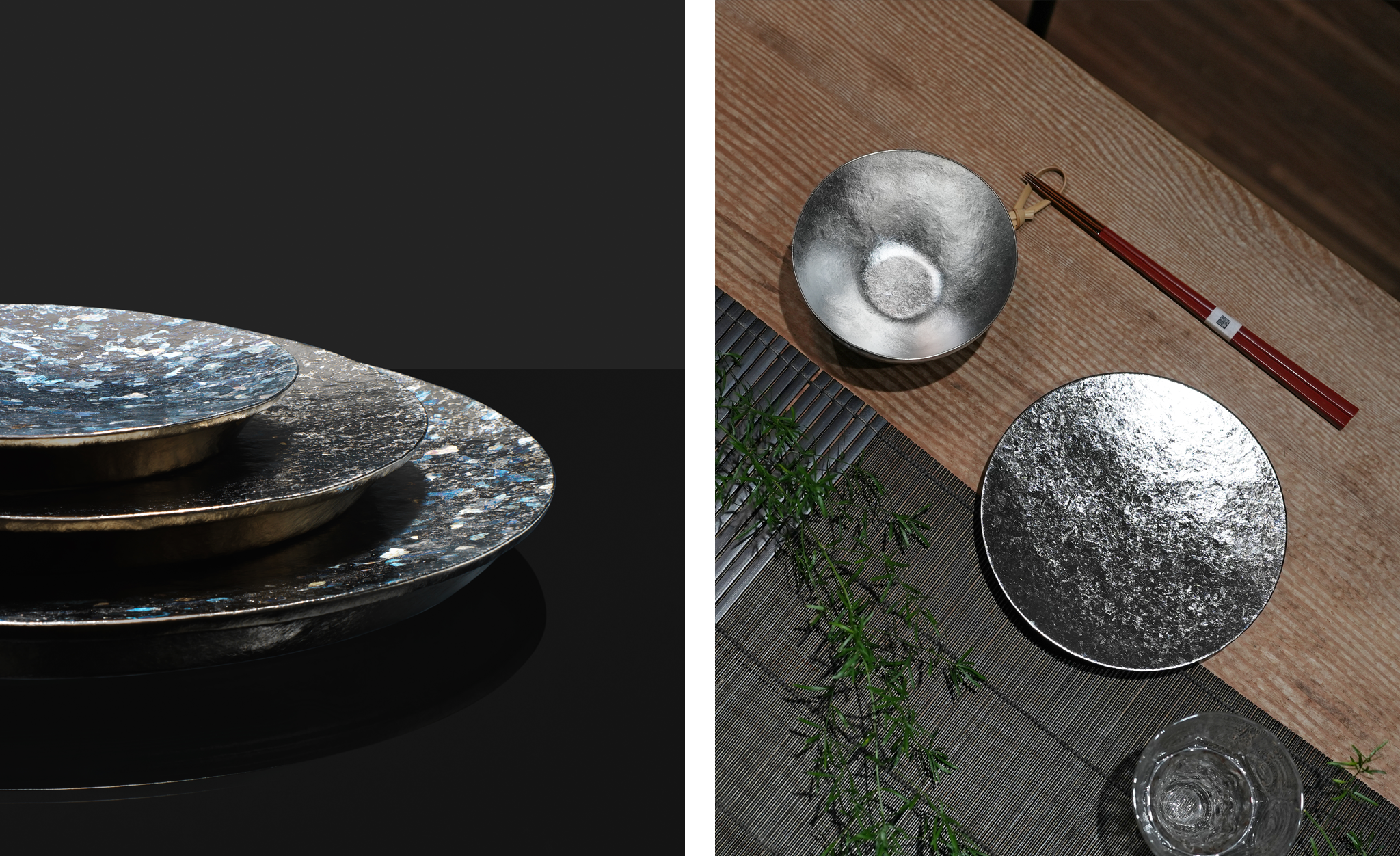 SUS gallery 今年特別為餐具系列延伸設計,繼真空鈦碗及不鏽鋼餐叉後,推出全新「銀月鈦盤 」系列,提升餐桌搭配豐富度。從盛裝湯料理的深真空碗,直至呈現多樣菜餚的平面圓盤,皆設計有保溫效果的雙層真空結構與經典鈦金屬如雪花結晶般的紋理。由於鈦金屬堅硬且加工時易斷裂的材質特性,大面積製作極具挑戰,從圖稿構思至成品共耗時約四年,經研究團隊與專家不斷測試,完成生產此系列。每件鈦盤,經職人們反覆拋光、精密焊接與調整細節等多道工序,每月僅能生產50件,工藝尤其珍稀。