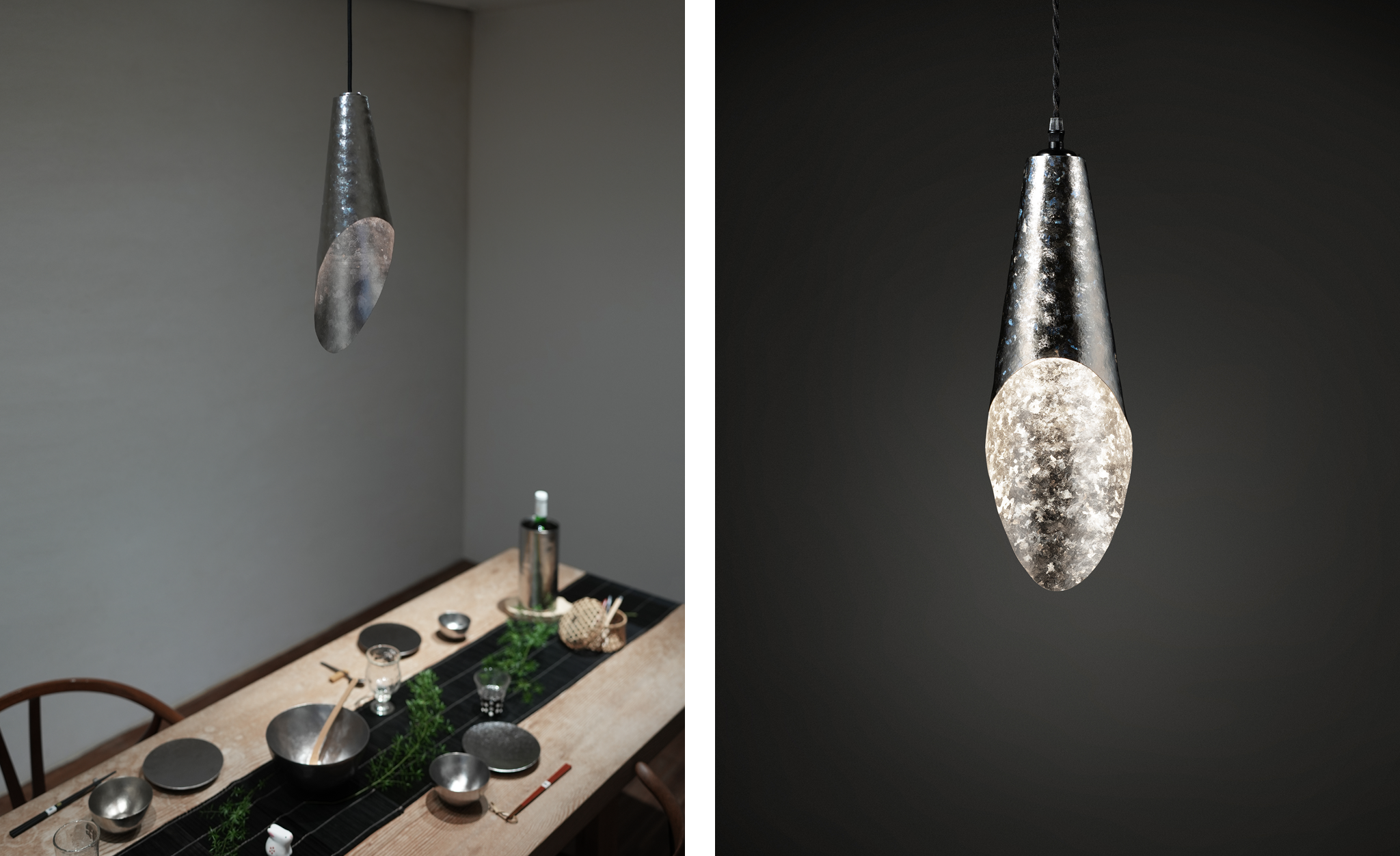 設計靈感源於植物有機形,以海芋姿態為發想,斜邊切口與側面曲線連貫,相互呼應俐落卻保有優雅的靜謐。不透光的鈦金屬片,花瓣包裹逐漸柔散暈影,輕緩綻放的花蕊中心的錐狀光束,朝內緣反射如雪花結晶的美麗紋理。