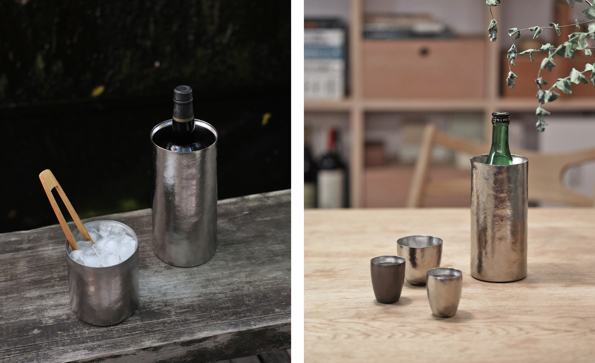 鏡面酒器冰桶,將紅酒瓶中放入其中,無需添加冰塊,讓餐期內也感受不降溫的滋味。多種尺寸鈦杯與容器,依不同情境需求使用,四季陪伴日常你我生活。