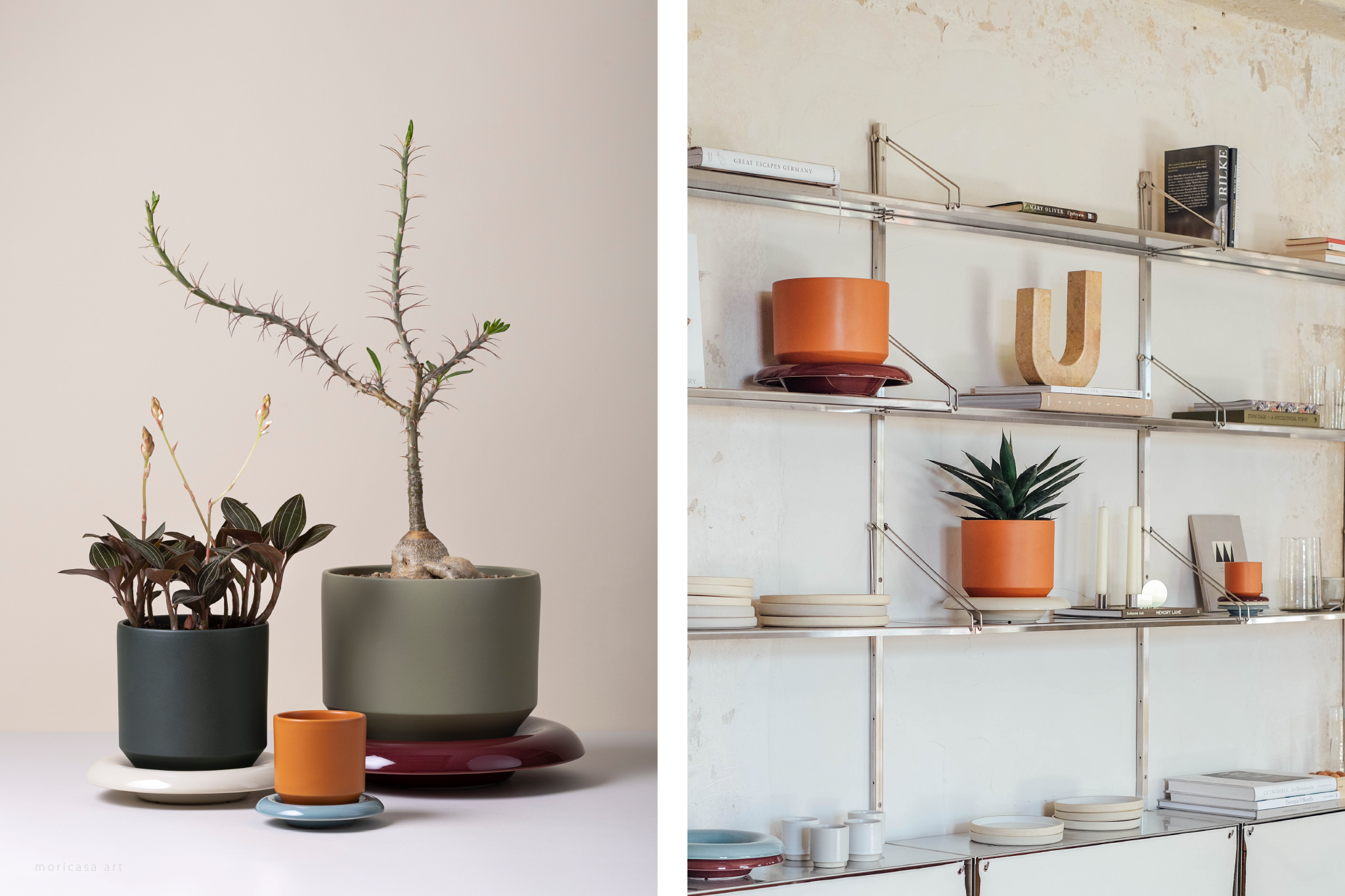 Bergs Potter 擁有二種鮮明對比的材質,能依植栽與擺設需求挑選陶盆。無釉裝飾的裸面陶盆,保留原始陶土微顆粒觸感,呈現礦物原彩的迷霧赤陶色與泥灰色,與植栽和諧融入空間中,無與倫比的特殊質感,宛若從大地生長般自然純粹。另有亮釉面系列,以飽和釉料完整包裹陶盆,豐富點綴室內場景。創立之初適逢戰爭期間,創辦人 Victor Berg 希望將繽紛色彩帶入生活,給人們活力及希望。