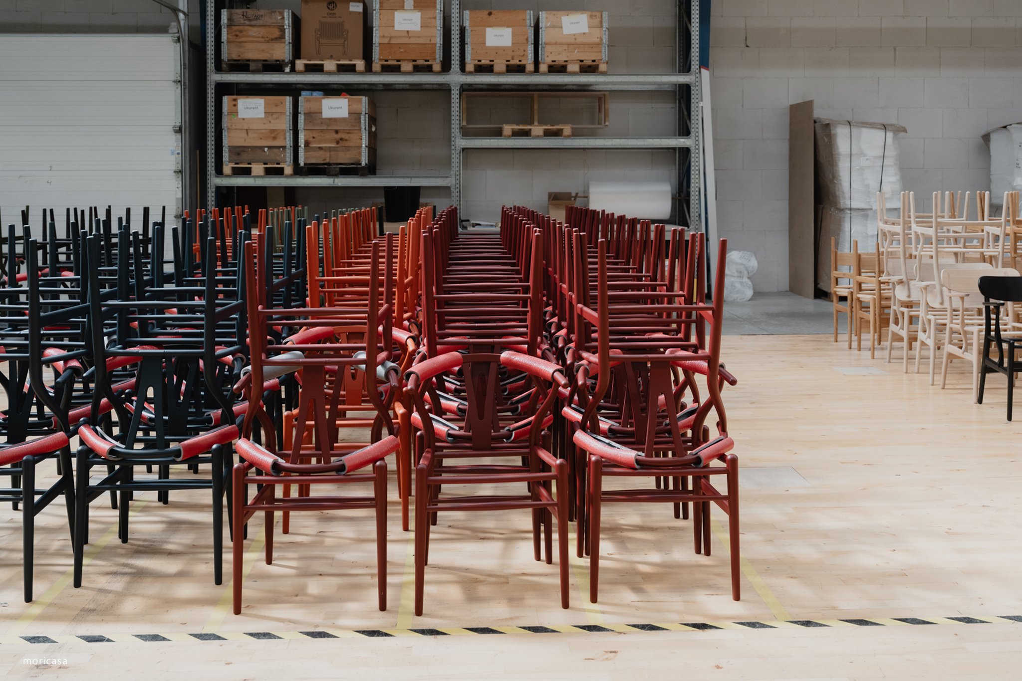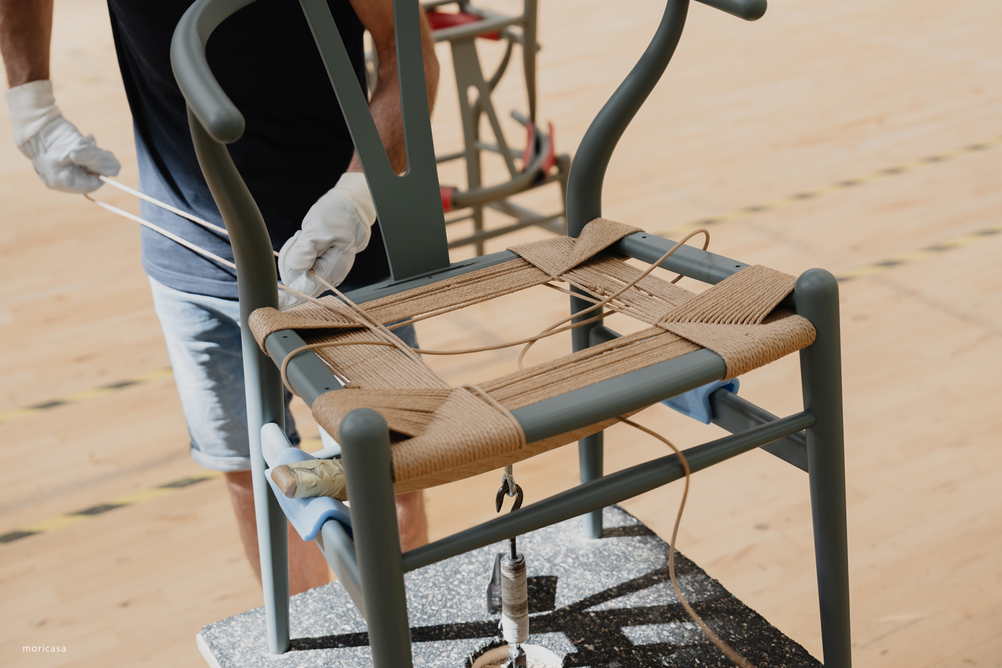 深入 Carl Hansen & Søn 的設計工坊,整齊排列的單椅在職人工匠熟練而專注的來回穿梭之中,反覆淬鍊逐步完成,細膩呈現品牌對工藝與設計的深厚堅持與傳承。
